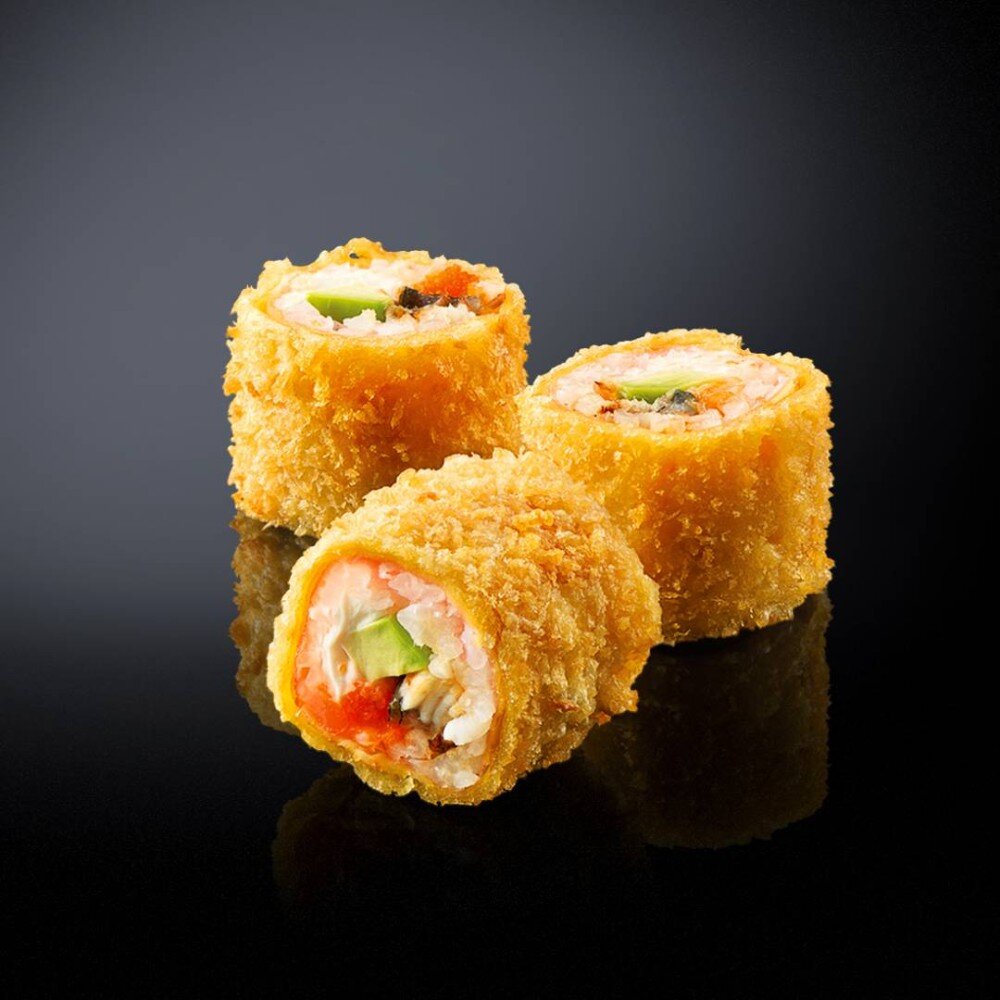 угорь, авокадо, масаго, сливочный сыр, тамаго, мамэнори, темпура. Сервируется цитрусовым соусом "Спайси" (6 шт.)