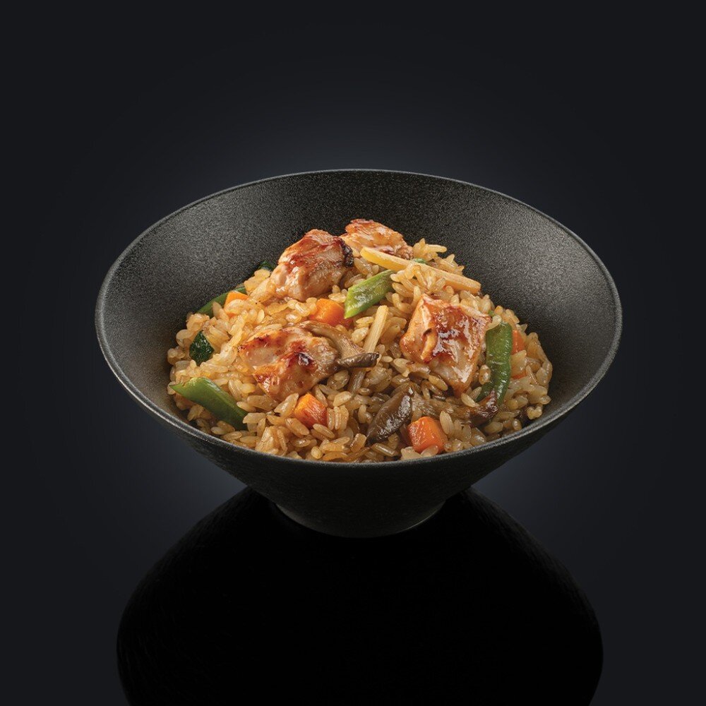 Приготовленный на воке рис с фасолью, мясом цыпленка, побегами бамбука, морковью, вешенками и цукини