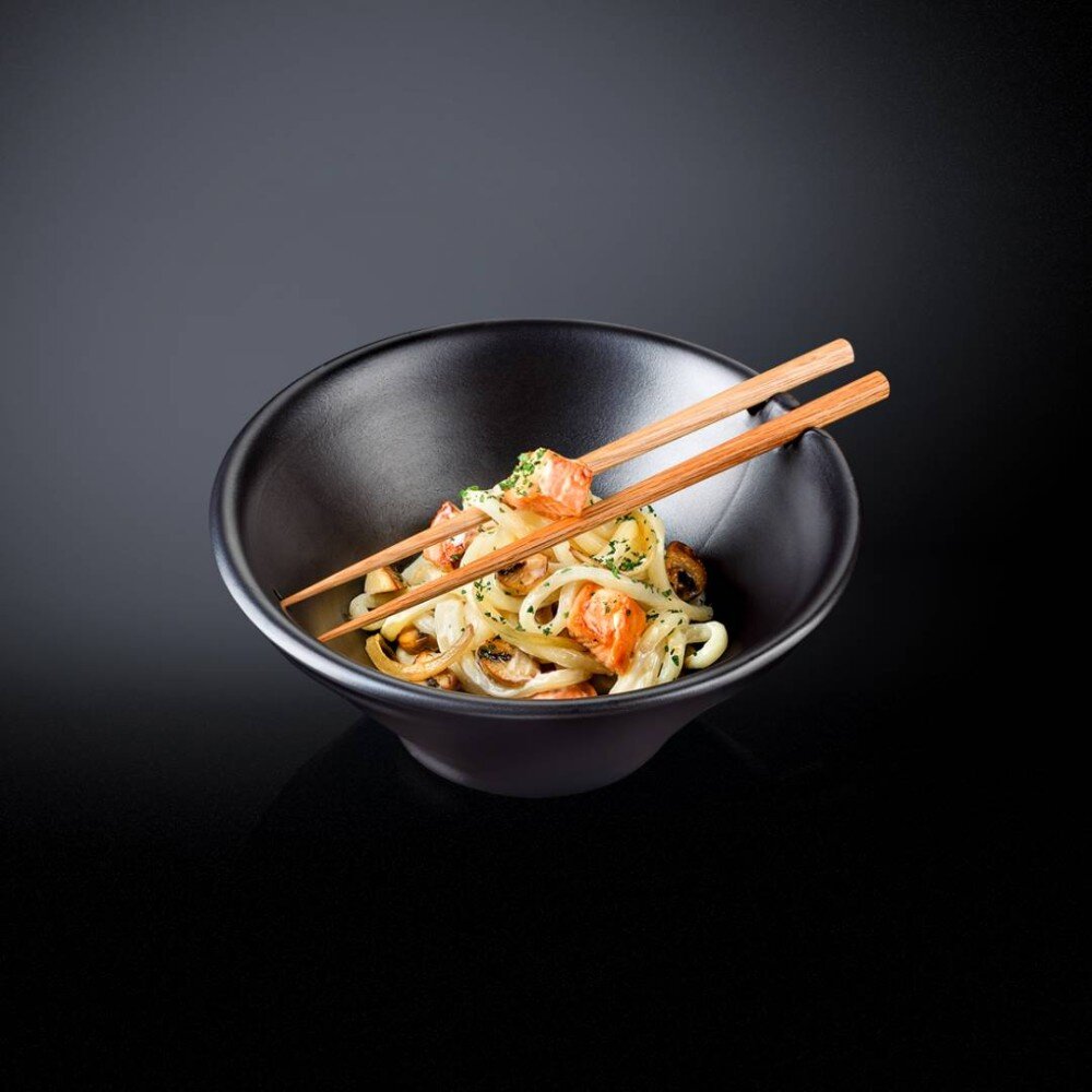 Широкая пшеничая лапша с лососем, шампиньонами, луком и зеленью, под сливочно-сырным соусом