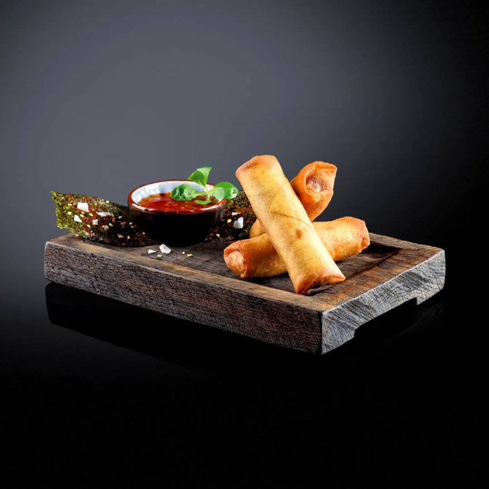 Роллы с овощами, рисовой лапшой и соусом "Хойсин", завернутые в тонкое тесто, обжаренные до хрустящей корочки. Подаются со сладким соусом "Чили".