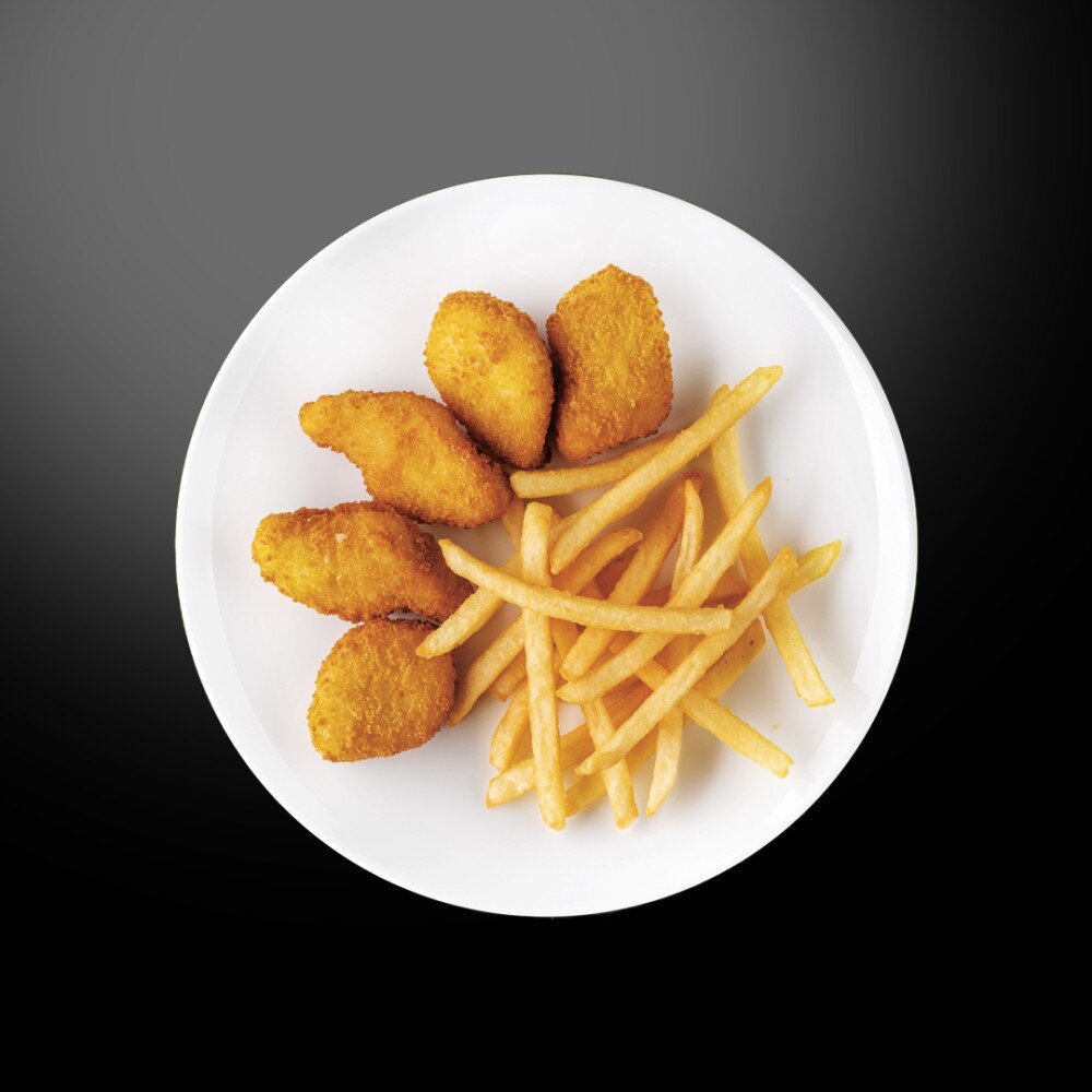 Куриные наггетсы. Подаются с картофелем фри. Соус на выбор; кетчуп, сметана, сырный, майонез.