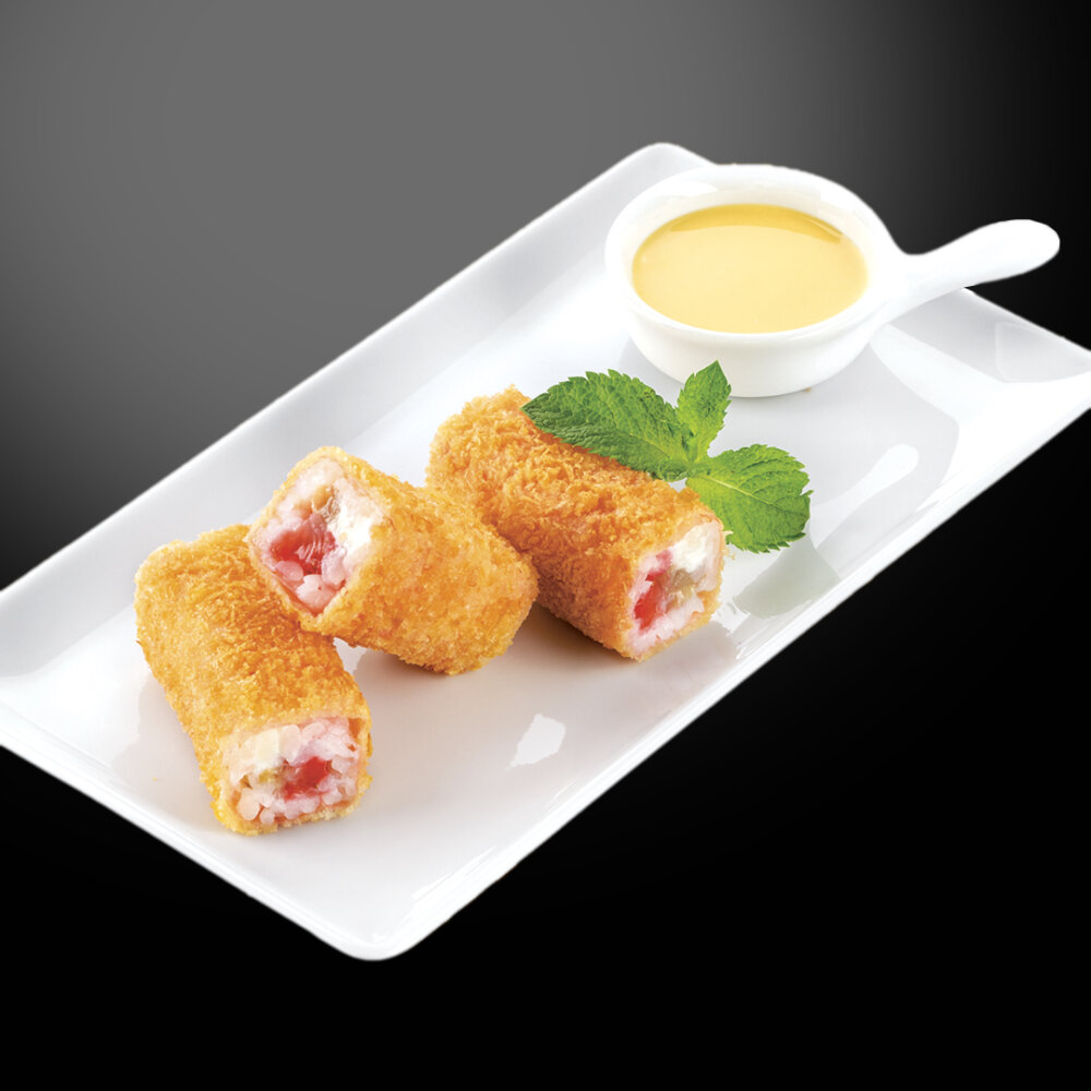 Сливочный крем, клубника и банан в маменори с рисом. Обжарены до хрустящей корочки. Подаются с ванильным соусом.