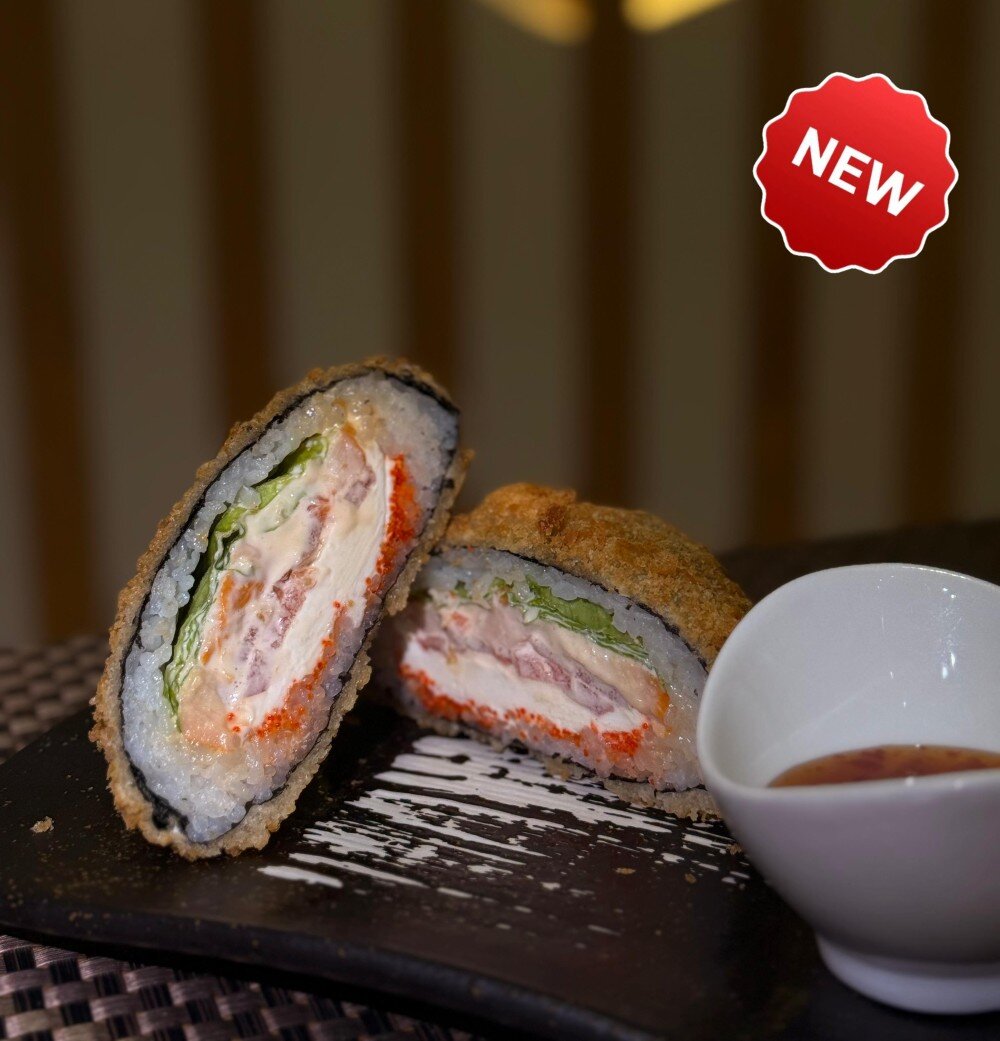 Рис, масаго, сливочный сыр, салат айсберг, помидоры, копченое куриное филе, соус Цезарь. Сервируется с соусом Сладкий Чили.