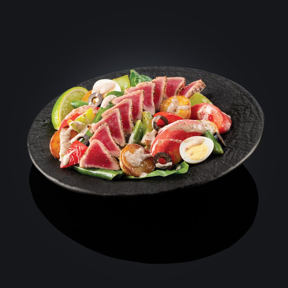 Обжаренный тунец , мини-картофель , болгарский перец , стручковая фасоль , листья шпината , оливки , томаты и перепелиное яйцо , с ореховым дрессингом.