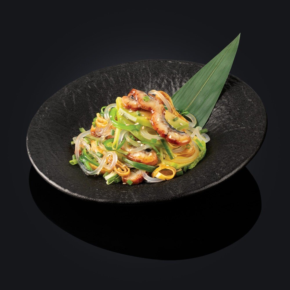 Копченный угорь , авокадо, зеленый лук , огурец, тамаго, маринованные водоросли , лапша харусаме, кунжут, соус "Унаги".