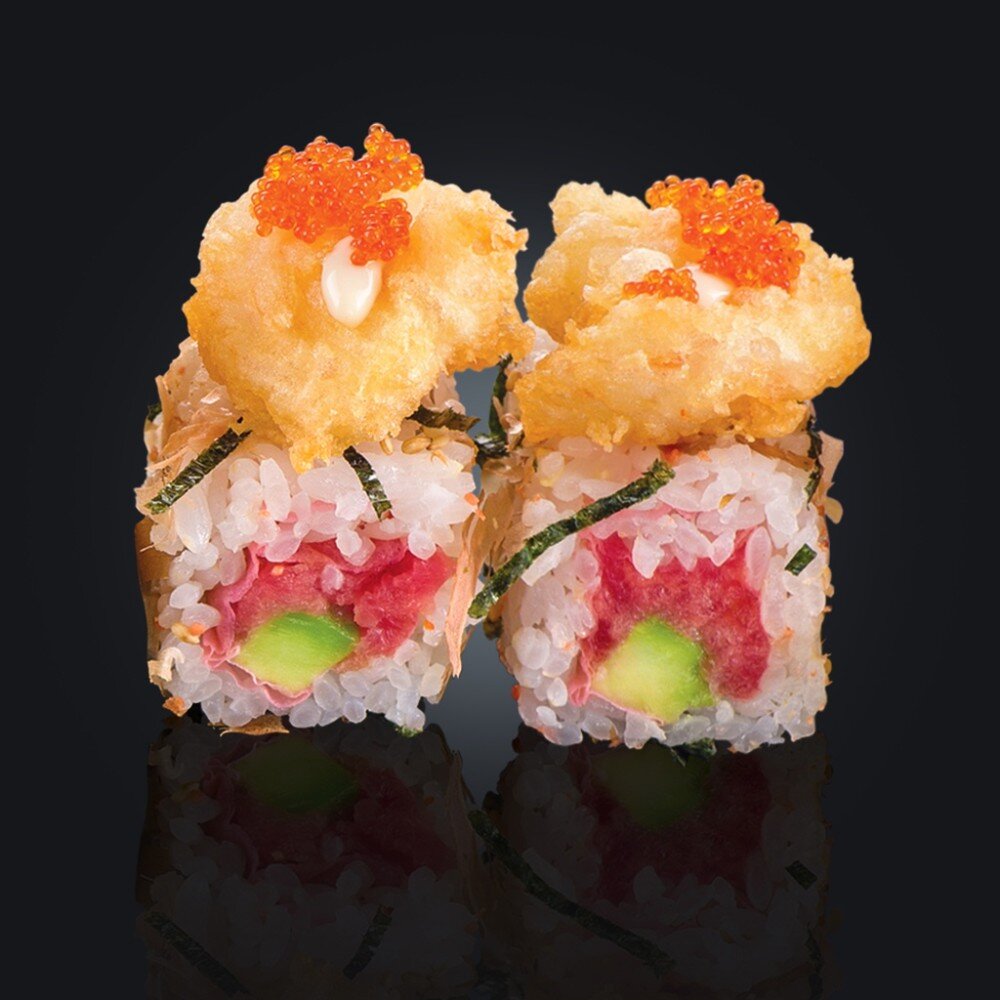 Тигровые креветки в темпуре, лосось в соус 0ще "Спайси", авокадо, васаби, соус "Динамит" (6 шт.)