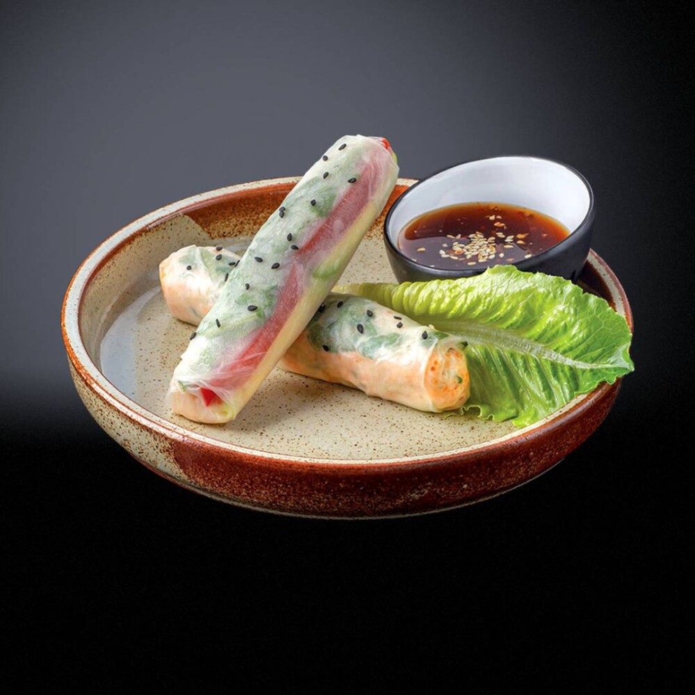 Ролл "Калифорния" в рисовой бумаге , с рукколой, овощами, крабовым мясом и тигровыми креветками. Сервируется с вьетнамским соусом.
