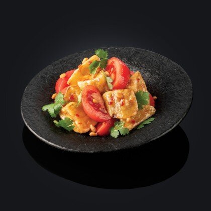 Морской гребешок, креветки , кальмар в сладком кунжутном чили соусе, с листьями сезонного салата.