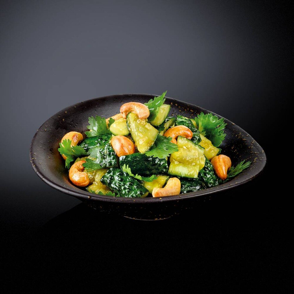 С кинзой и орехами кешью, в пикантном соусе из черного уксуса.