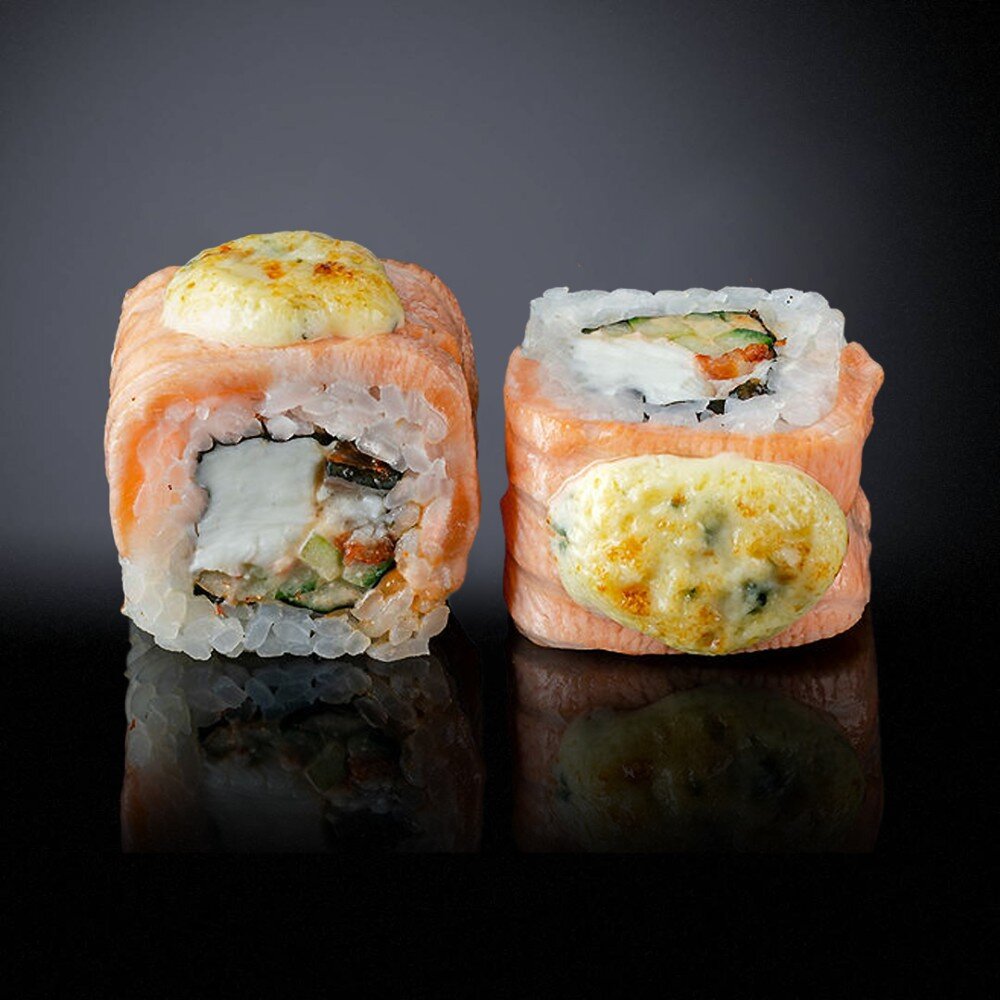 запеченный лосось, копченый угорь, огурец, сливочный сыр, соус из голубого сыра"
