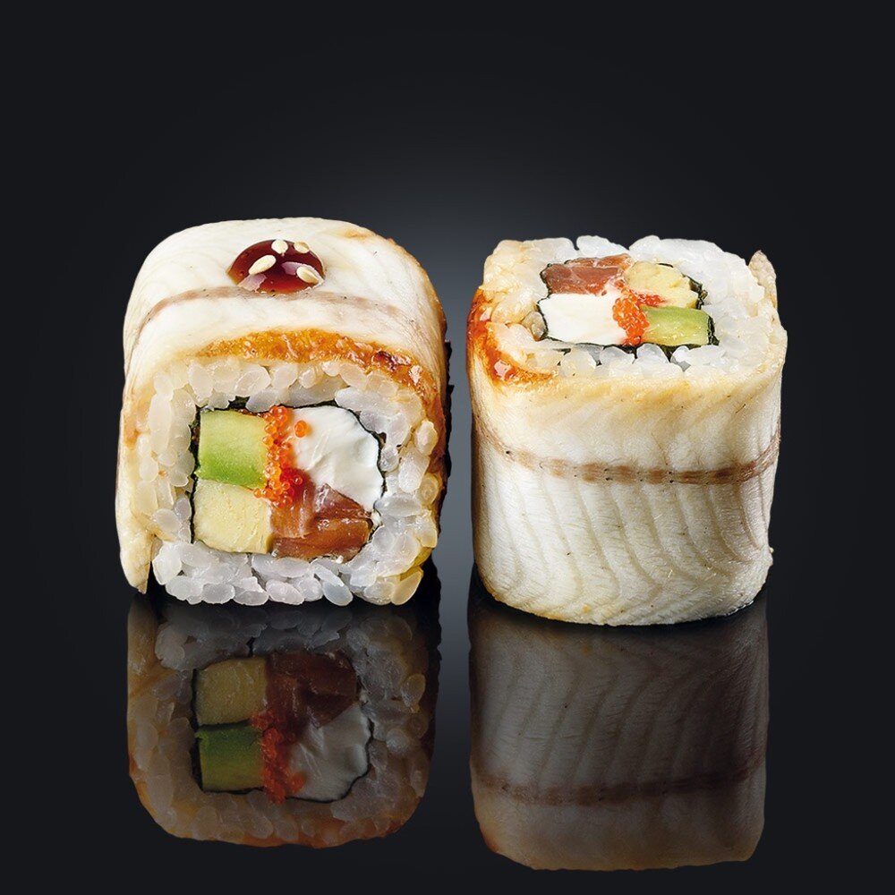 копченый угорь, сливочный сыр, спайси лосось "Бури", авокадо, масаго, тамаго (6 шт.)