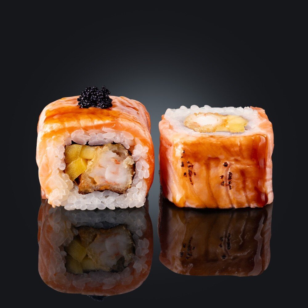 тигровые креветки в панировке, тобико, обжаренный лосось, манго, соус "Унаги" (7 шт.)